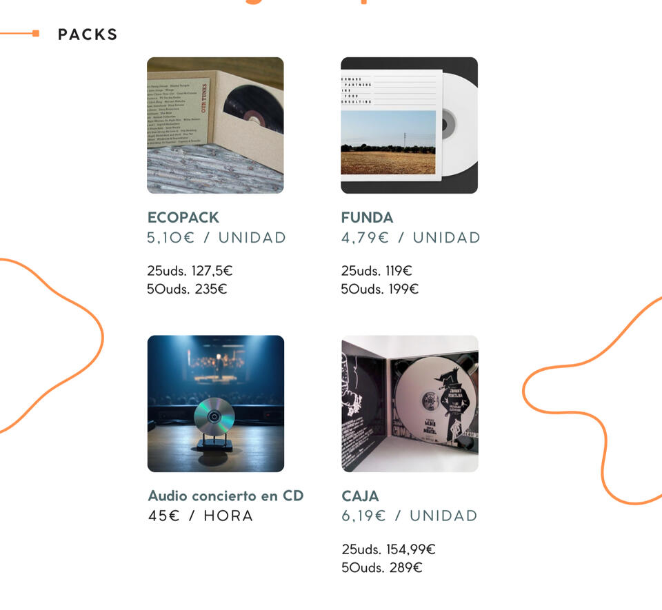 Venta física de CDs tanto para artistas emergentes cómo para clientes establecidos.